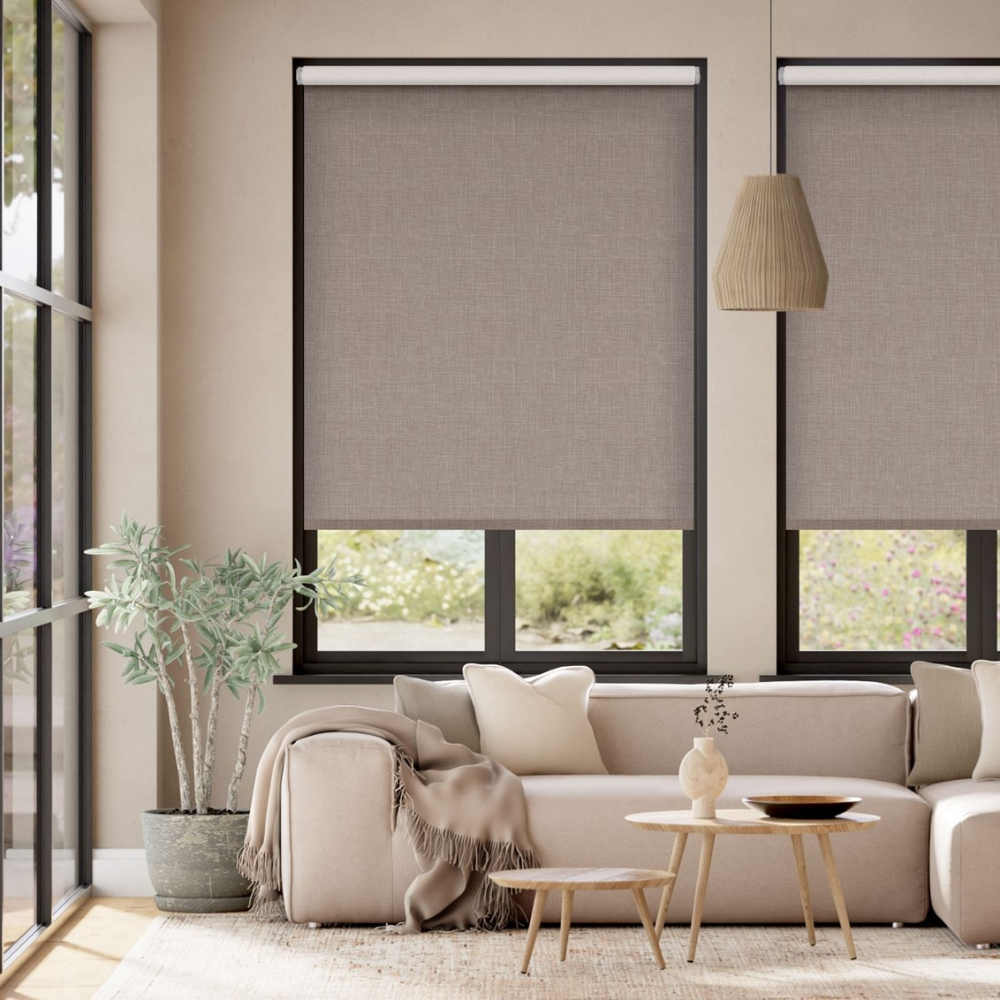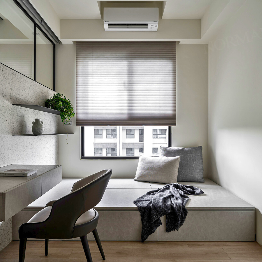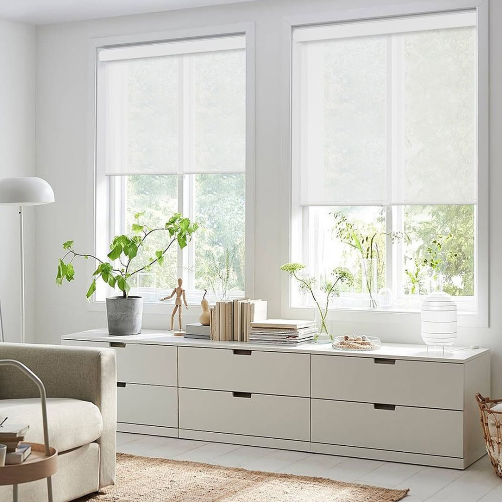 A modern window solution. These shades, crafted from fabric, operate smoothly. They can be effortlessly controlled via a remote or smartphone to roll up or down, offering convenience and a sleek appearance.