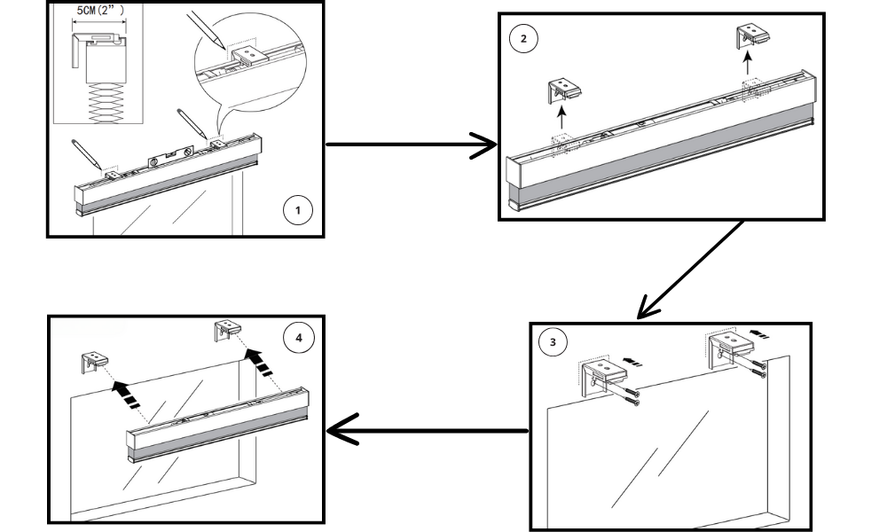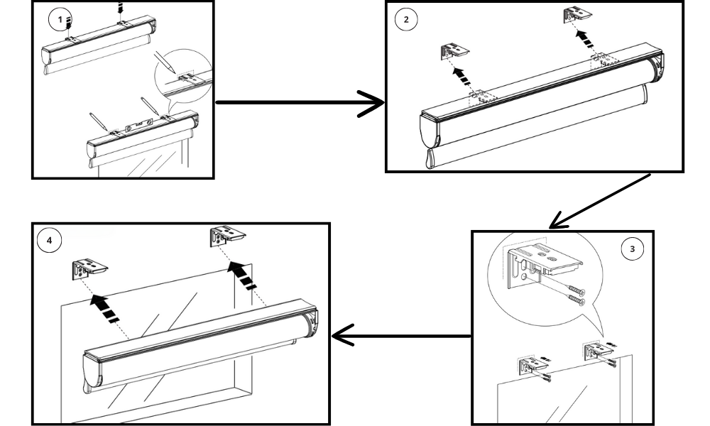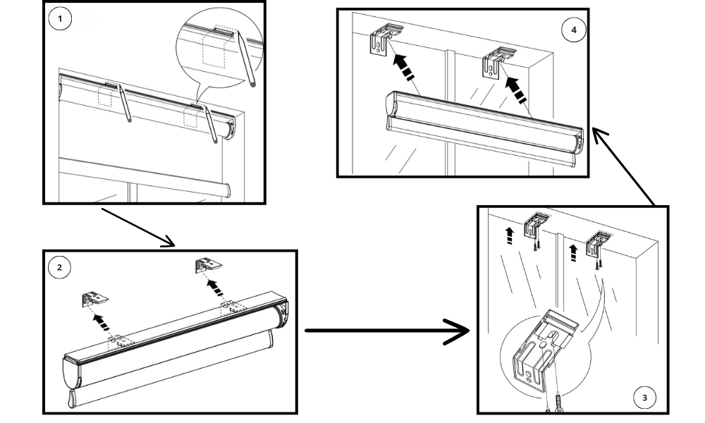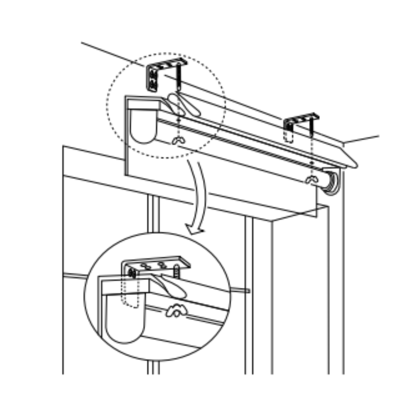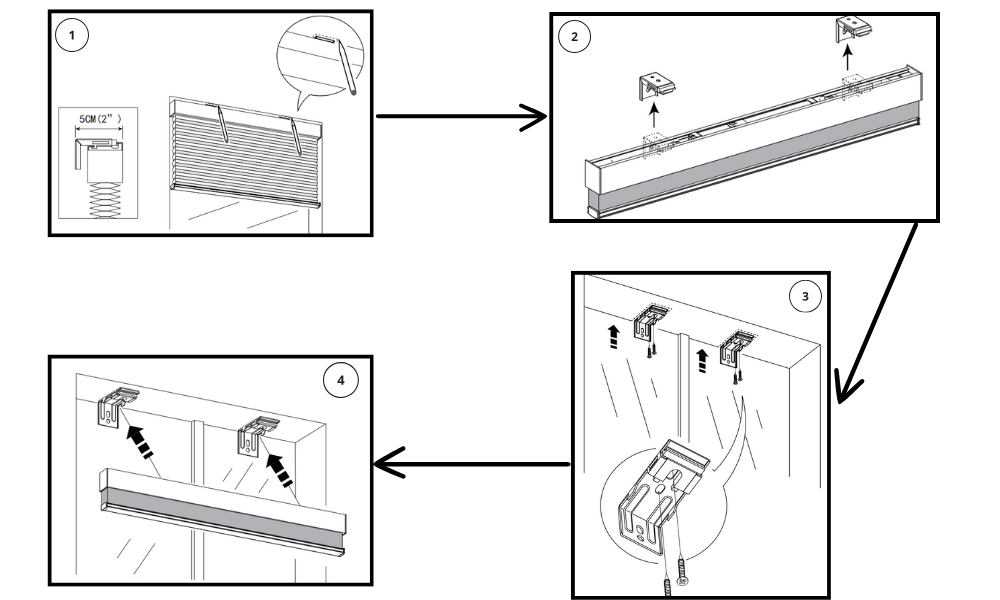 2.Mark screw locations and drill pilot holes.Screw brackets in place.Slide or snap headrails into the brackets.
