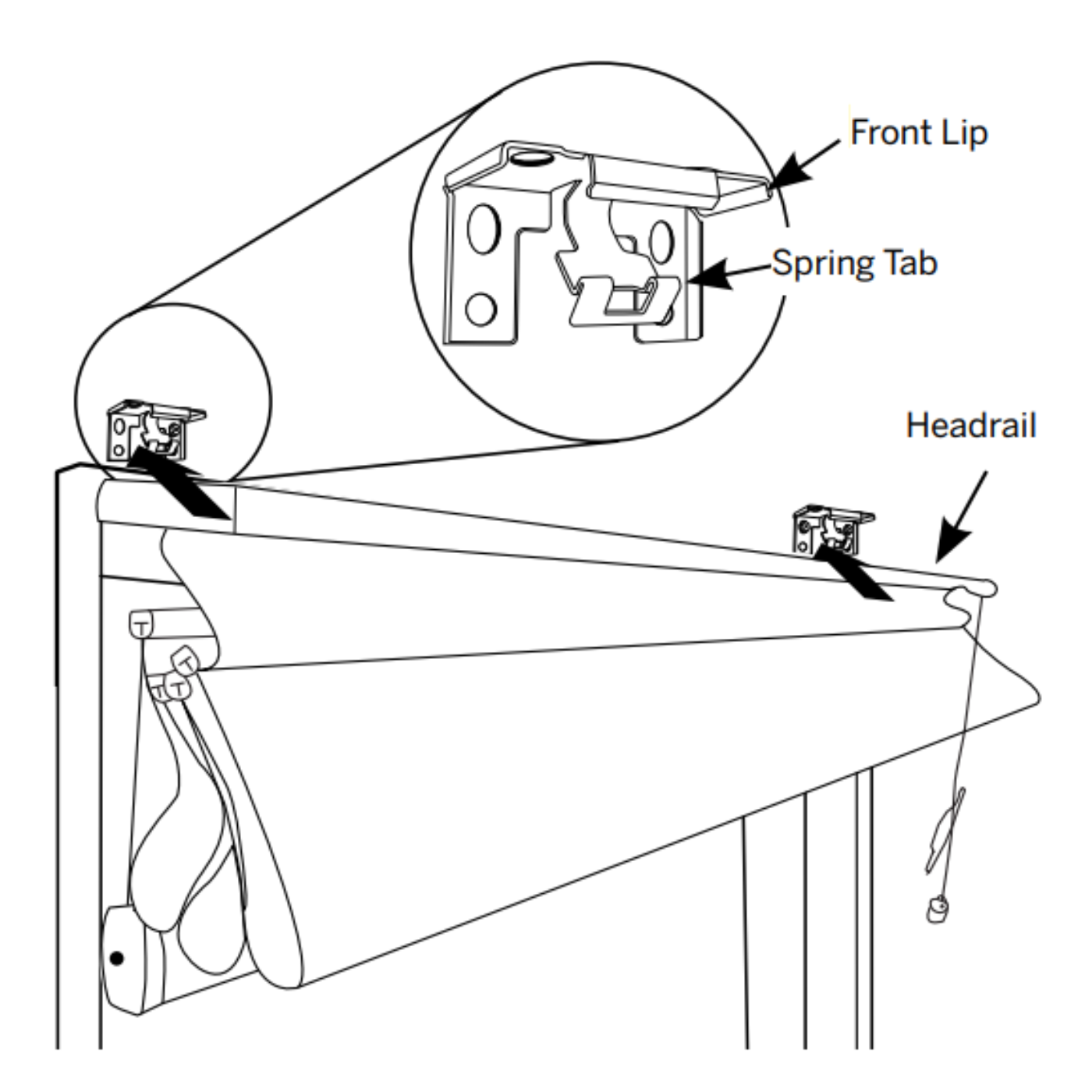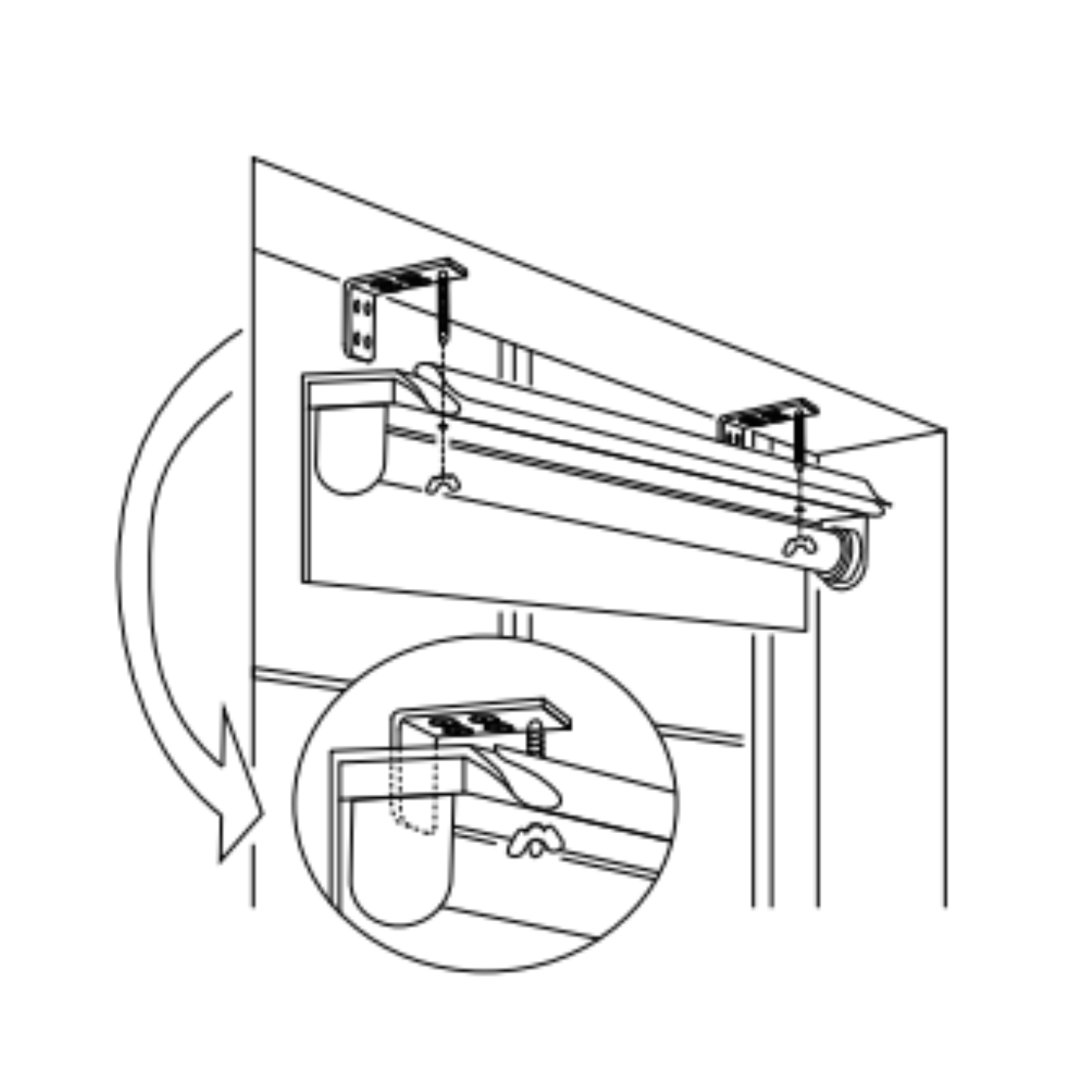 3.Raise the shade into the frame and position the headrail into the brackets. Rotate the headrail down until it snaps into place.Lower and test your new shade to ensure proper installation.