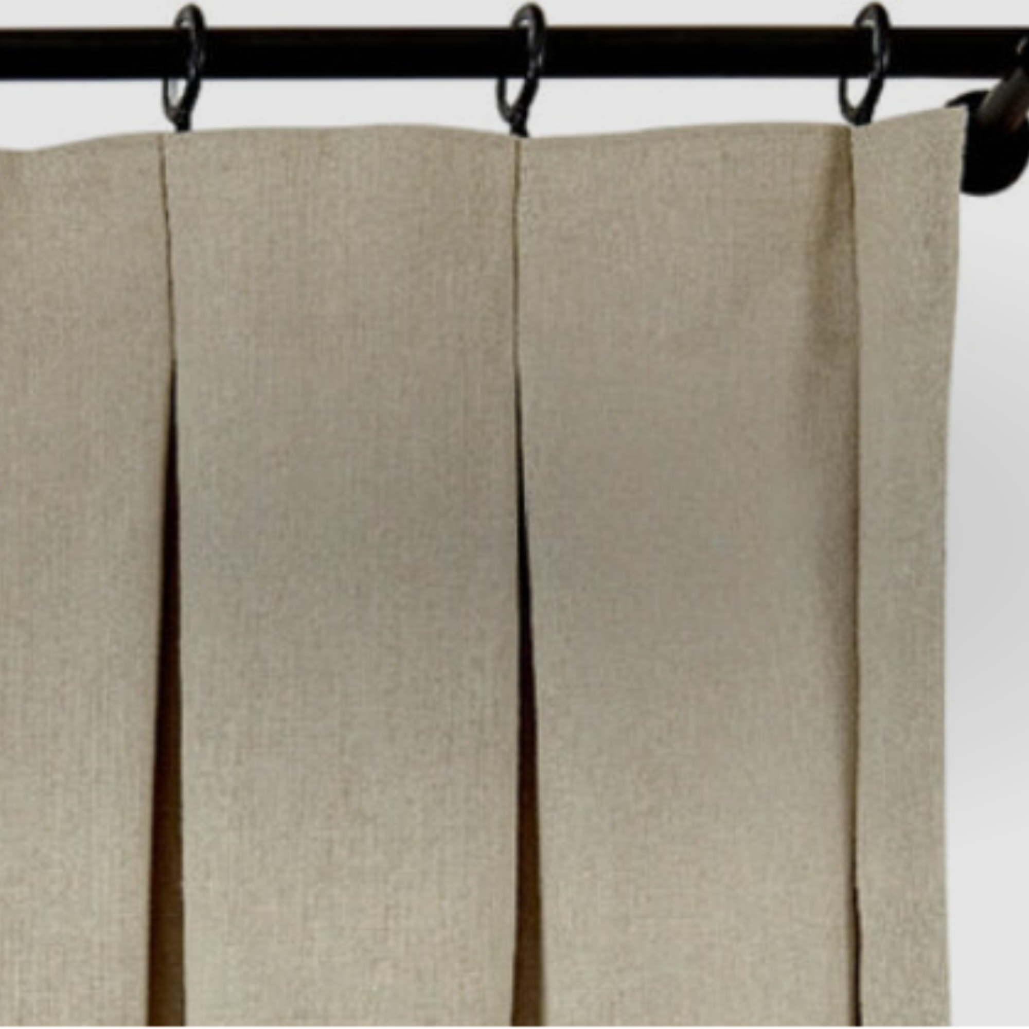 For pleated header styles, like pinch pleat, tailor pleat, inverted pleated box, goblet, and tape pleat, if the curtain finished length is over 108 inches, then the max finished curtain width without seam is 56 inches; if the curtain length is less than 108 inches, no seam for any curtain finished width. Otherwise, the width needs to be double-wide with a vertical seam.