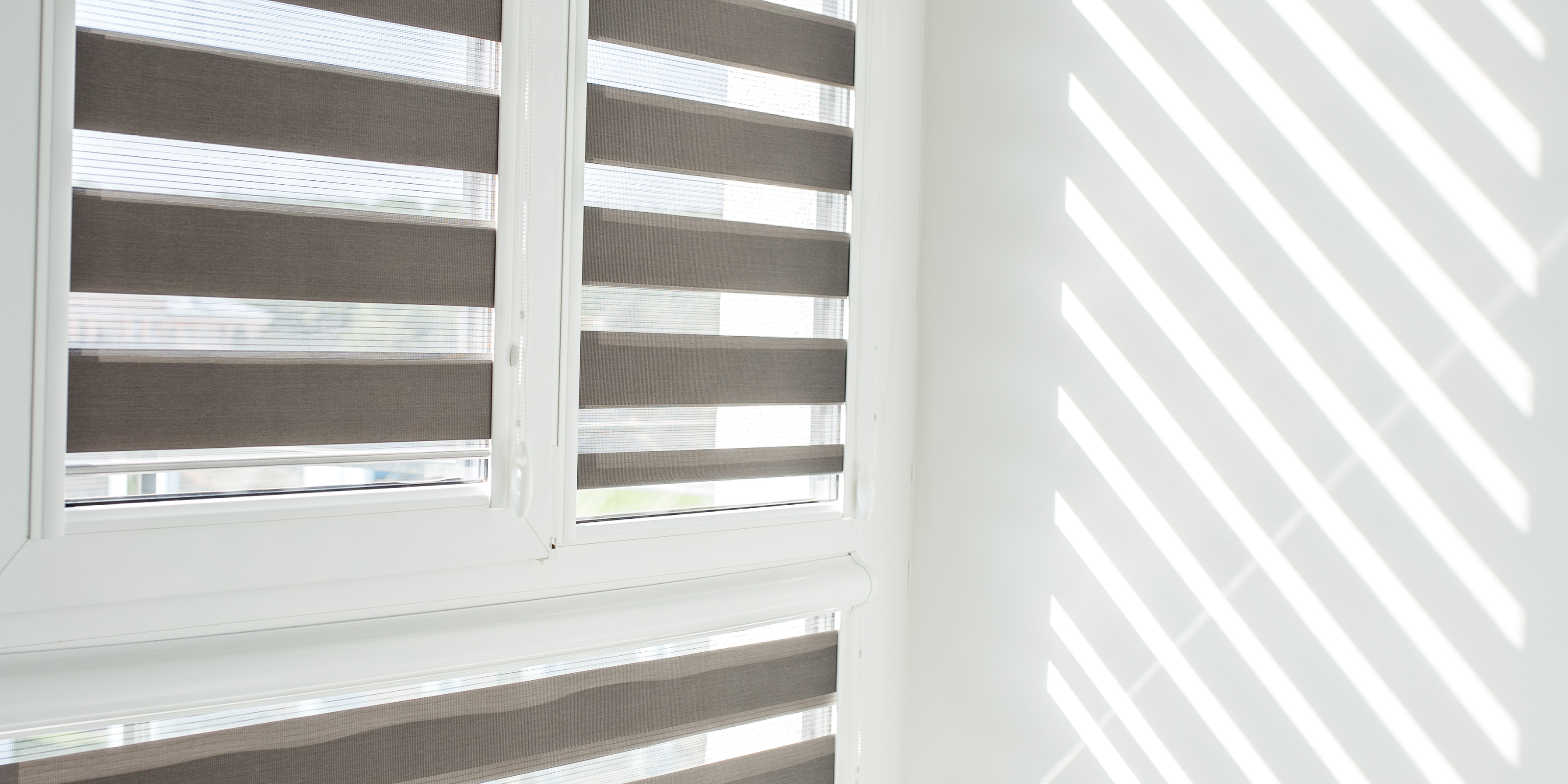 Versatile light control and privacy with alternating sheer and solid bands, combining modern style with practical benefits.